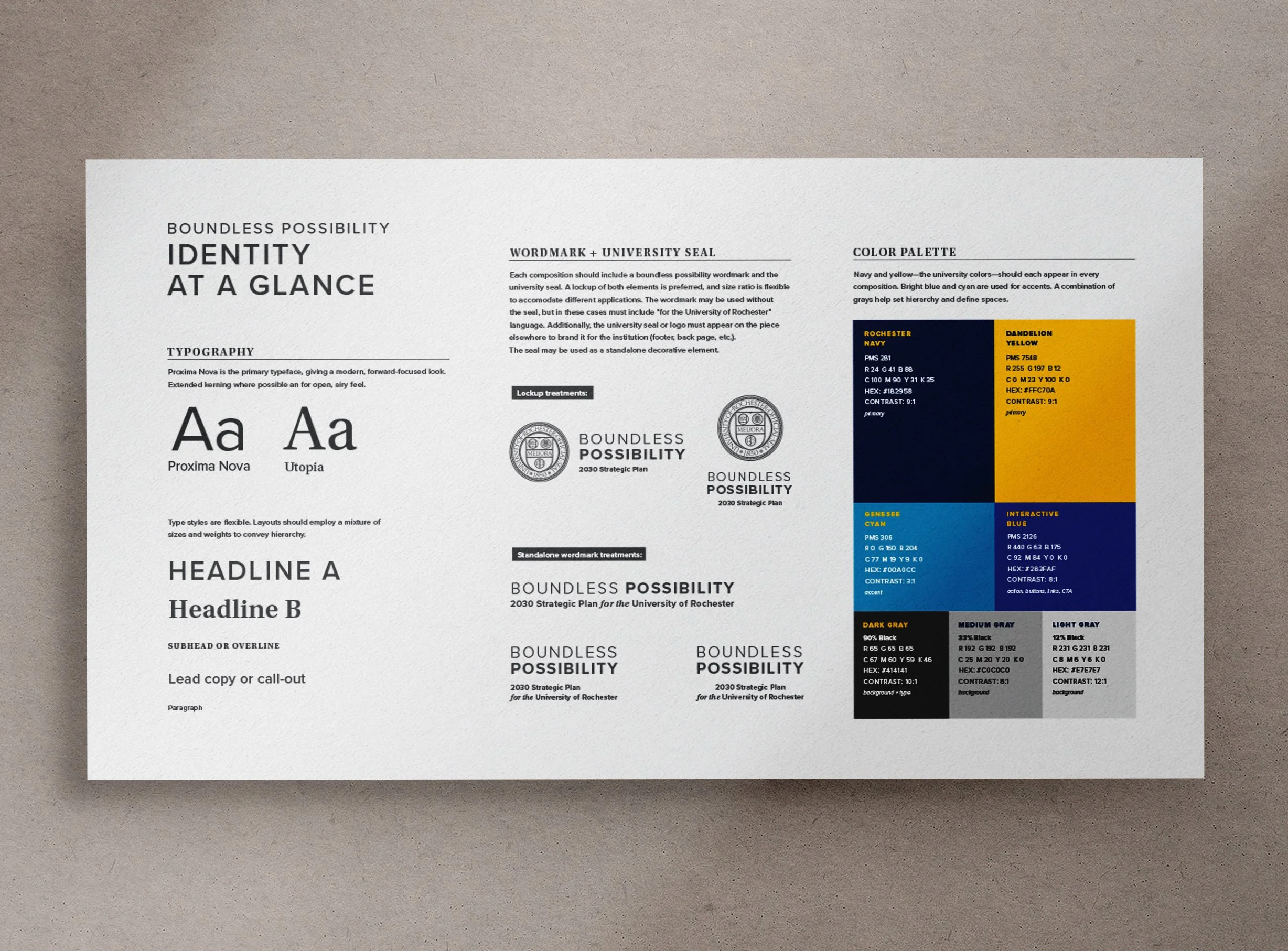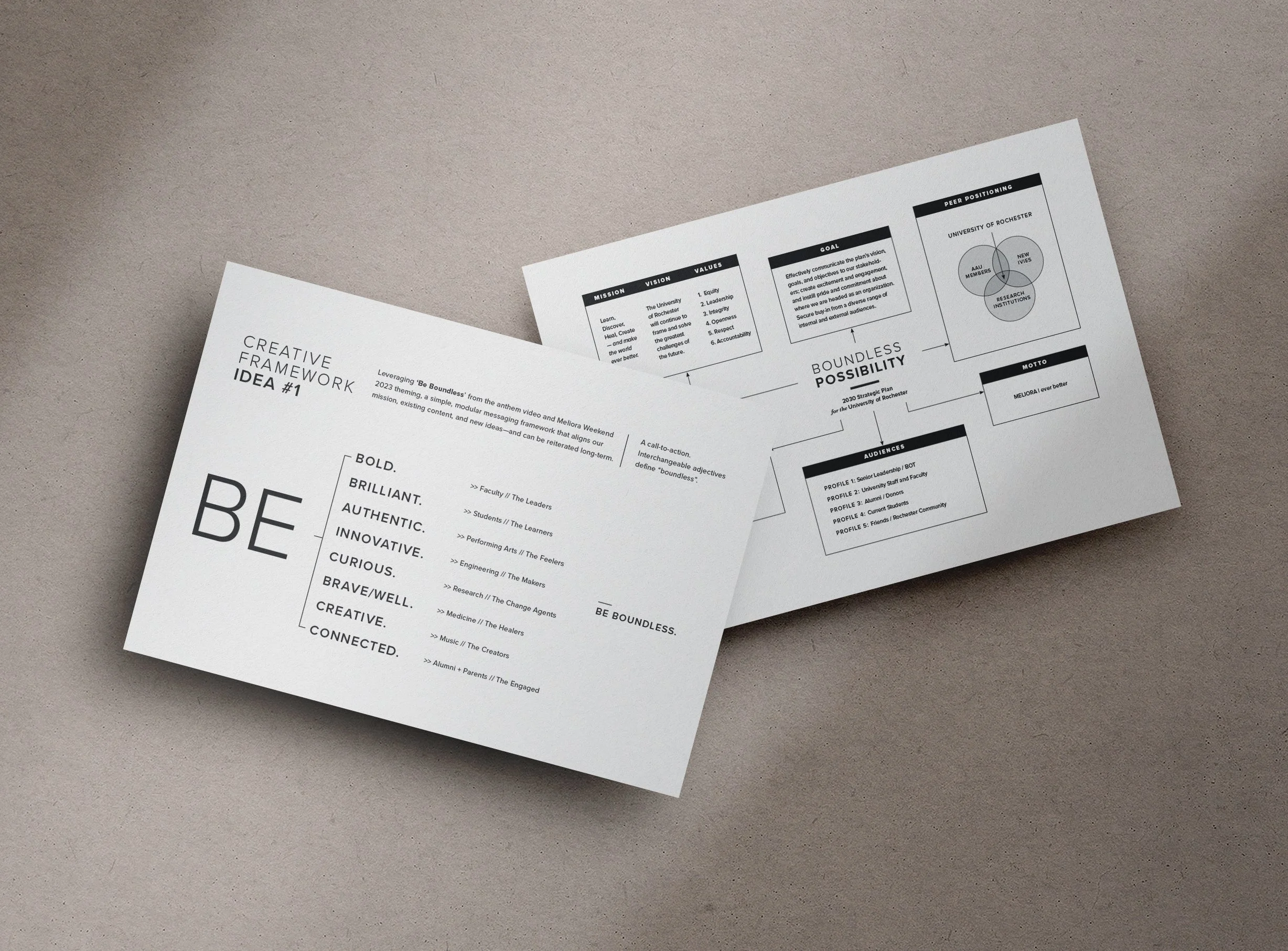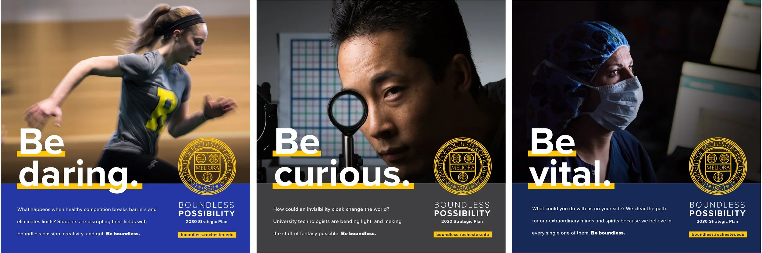 Bringing a university strategic plan to life is one thing. Getting students, faculty, staff, and community members to engage in the process is another. Where we would typically write a white paper and implement the plan at a leadership level, we pivoted to a call for ongoing conversation with our most important asset—our people. I led creative strategy, visioning, and platform development for a full marketing communications rollout and awareness campaign, robust website, sophisticated pitch decks, and an international roadshow event series featuring the president, star faculty, and inspiring students. We engaged with the university community on micro and macro scales with a call to action that encourages individuality, spirit, innovation, and grit. See more at boundless.rochester.edu